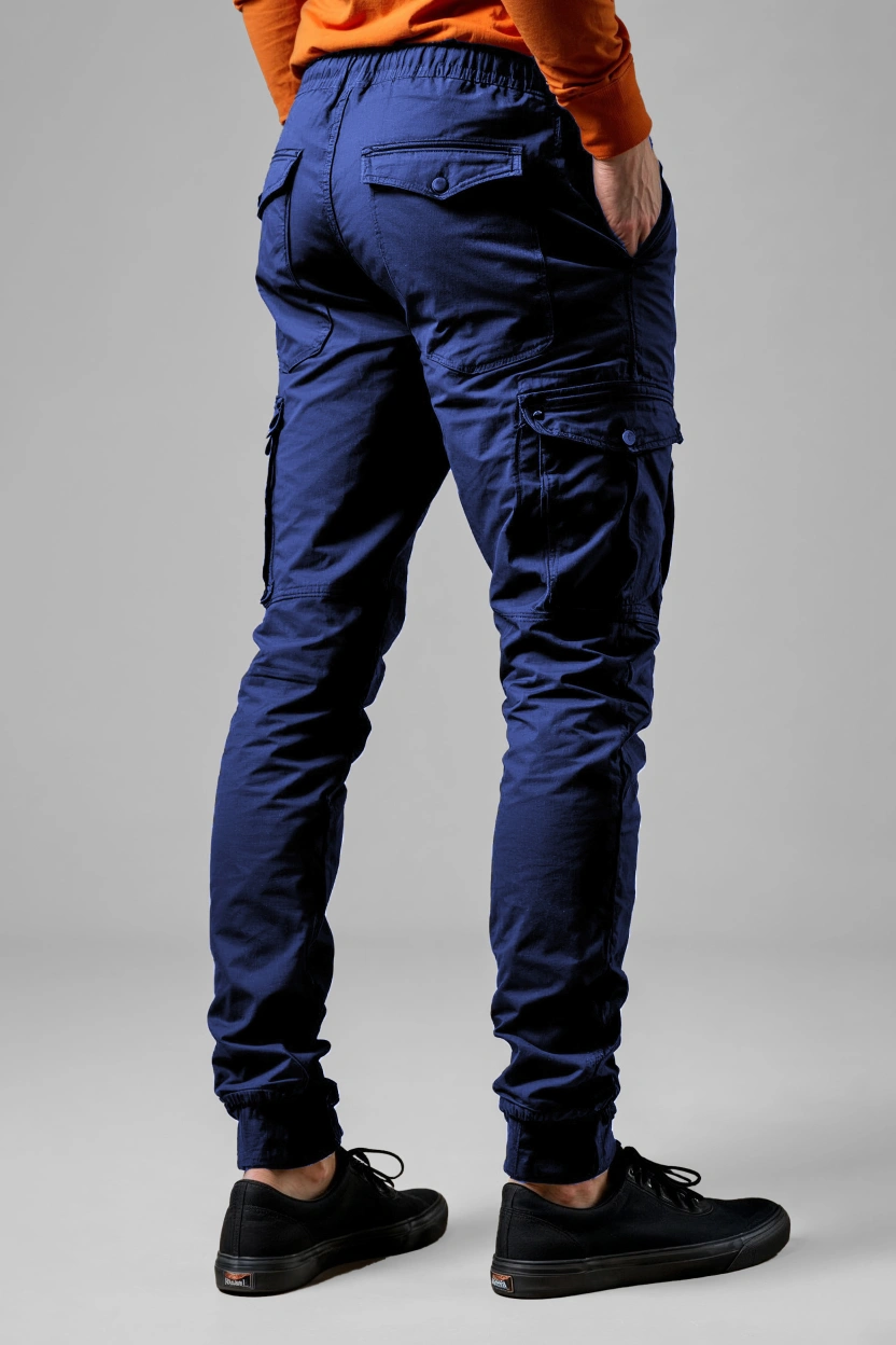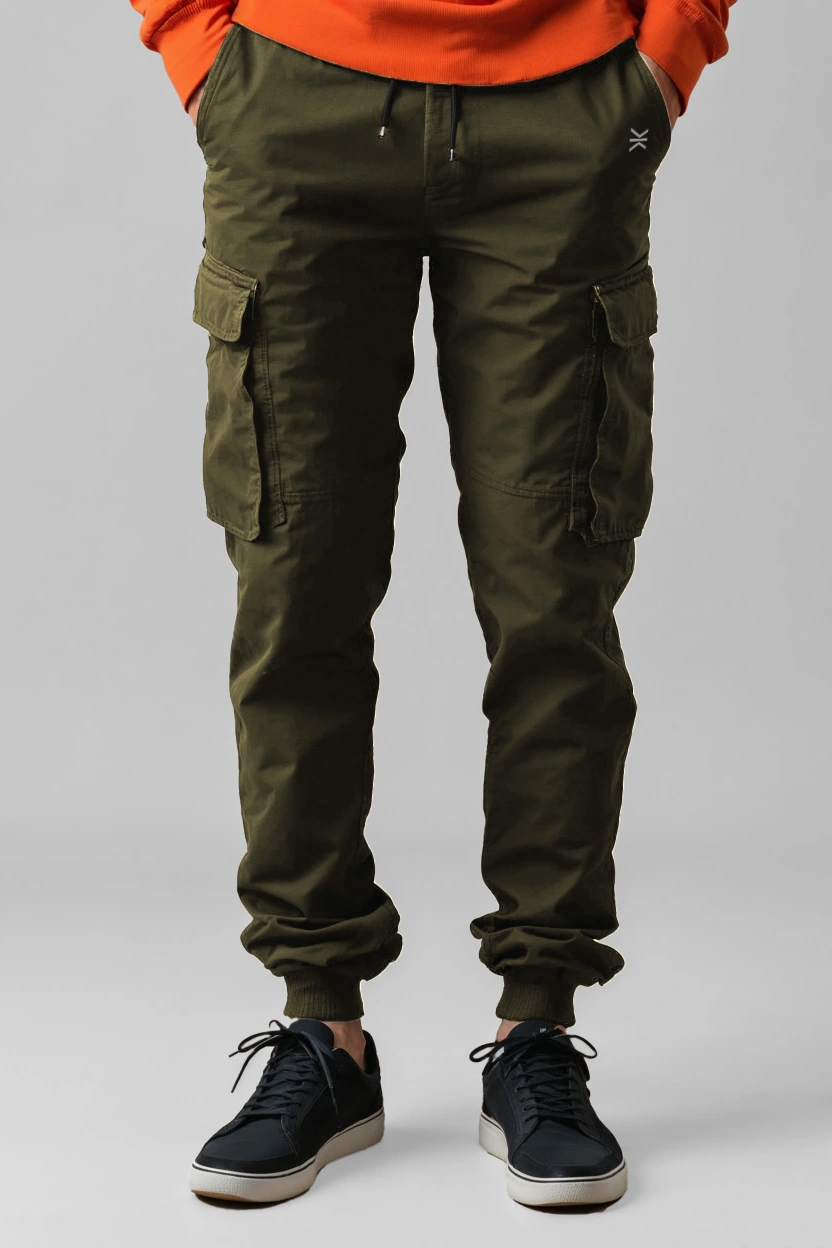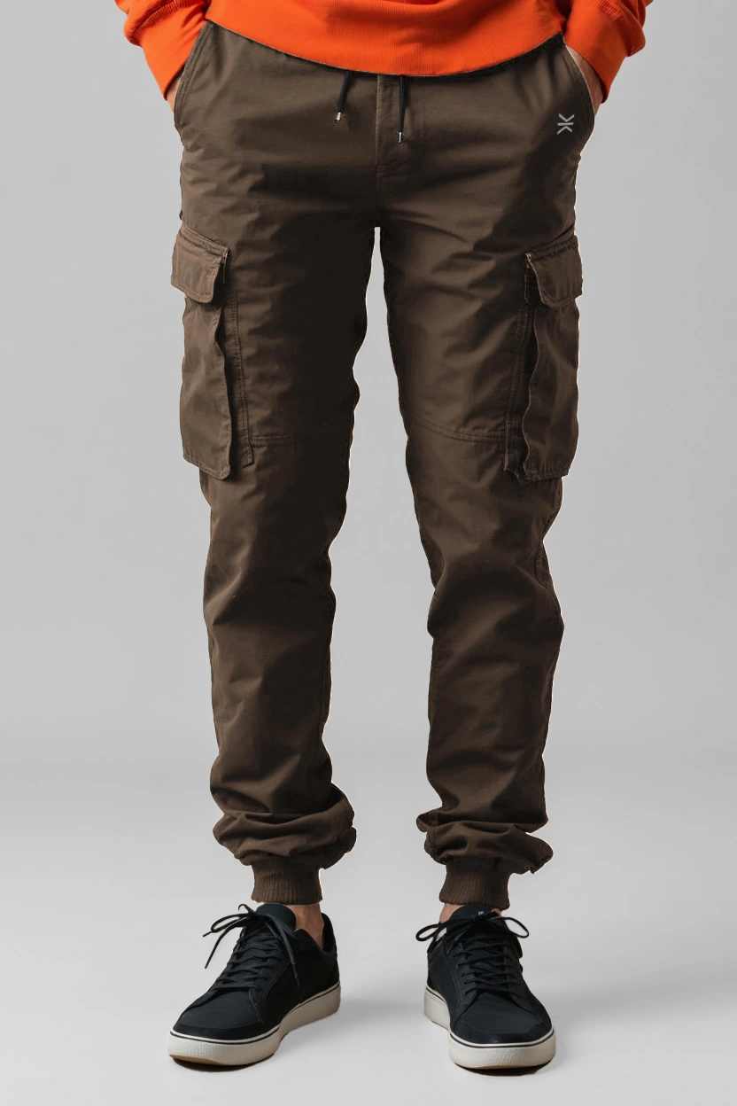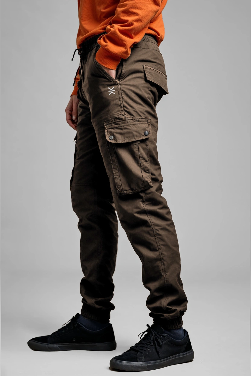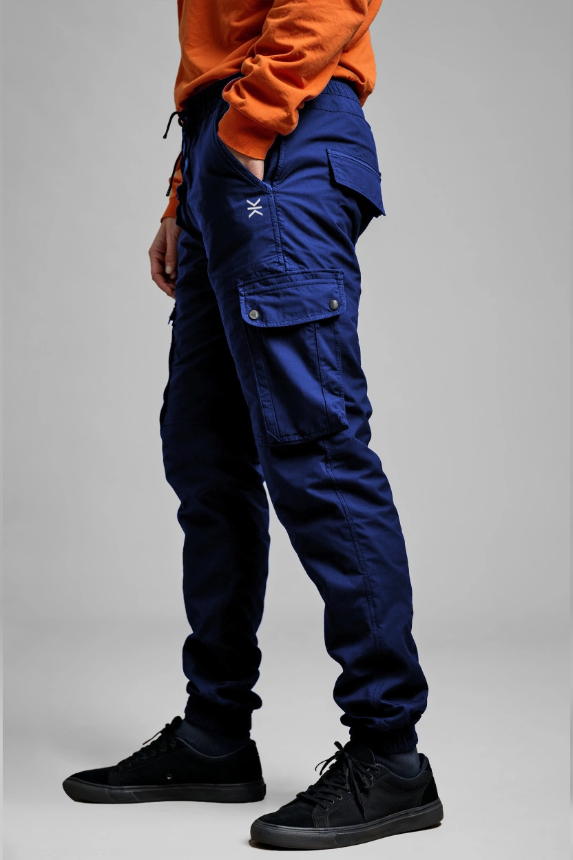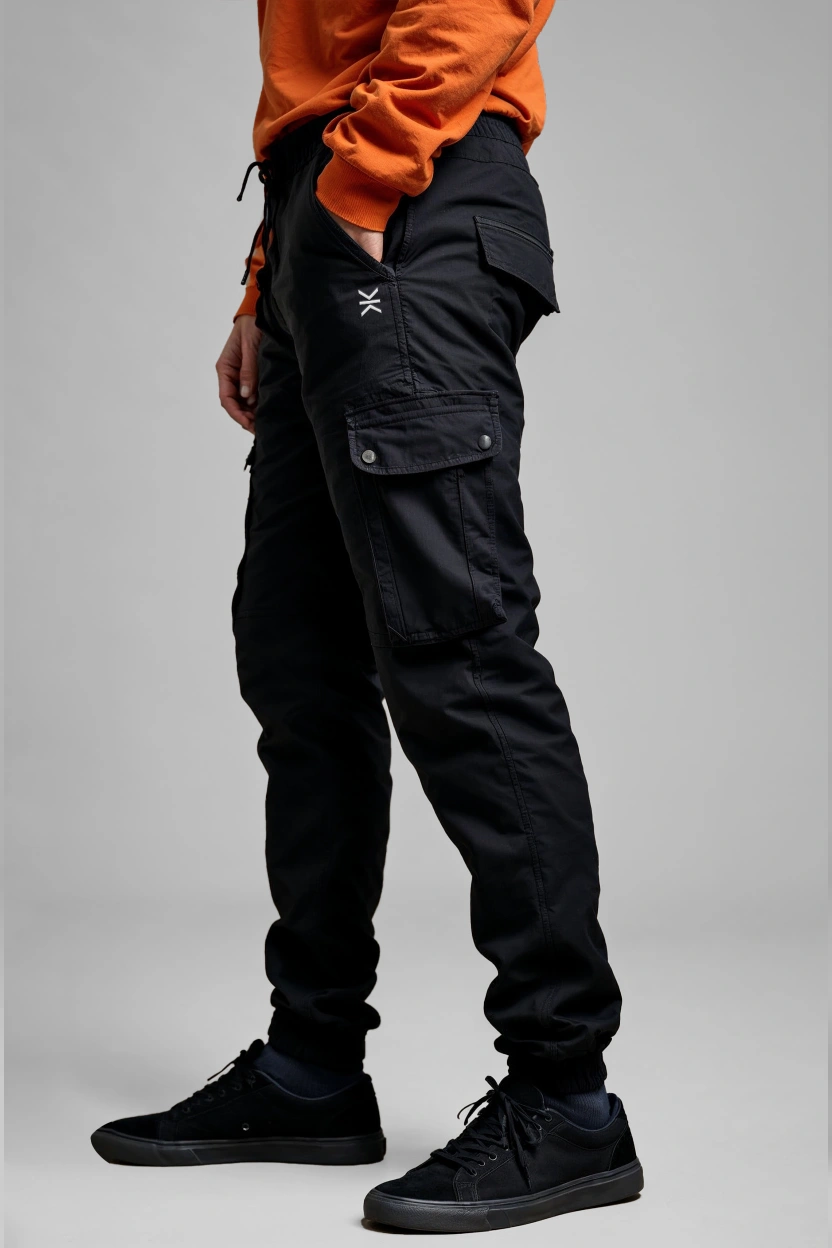 A drawstring waistband helps secure the fit, while ribbed ankle cuffs keep the legs in place during motion. Cargo pockets on both sides offer space for essentials without adding bulk, and the tapered shape maintains a clean athletic look.